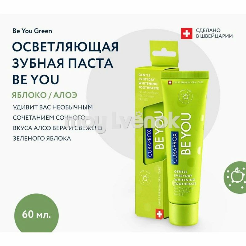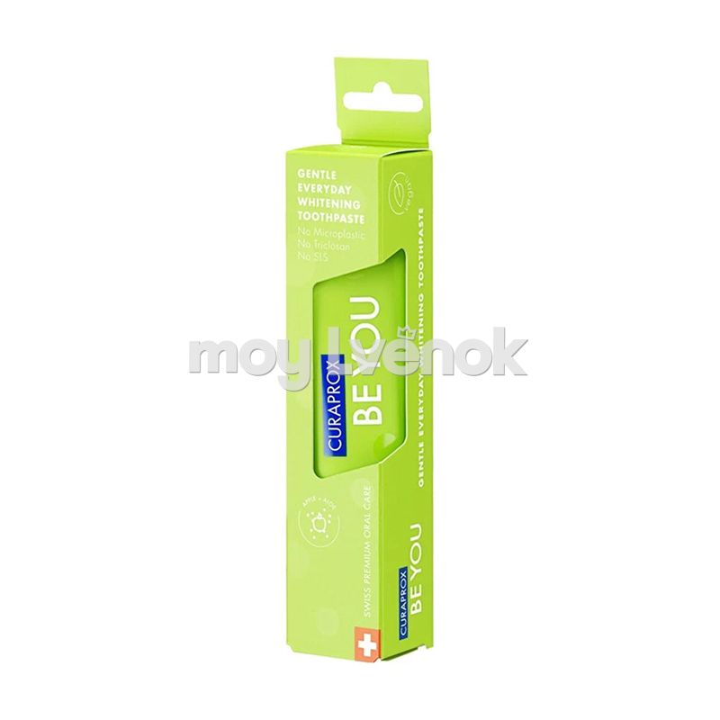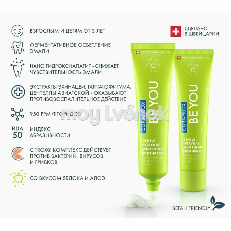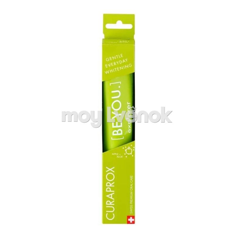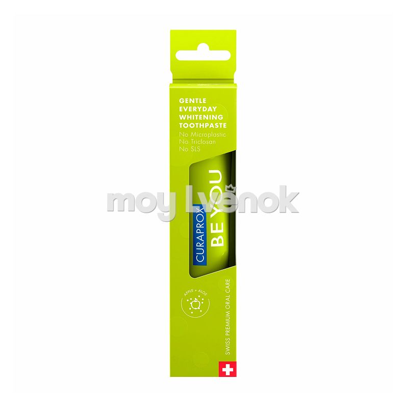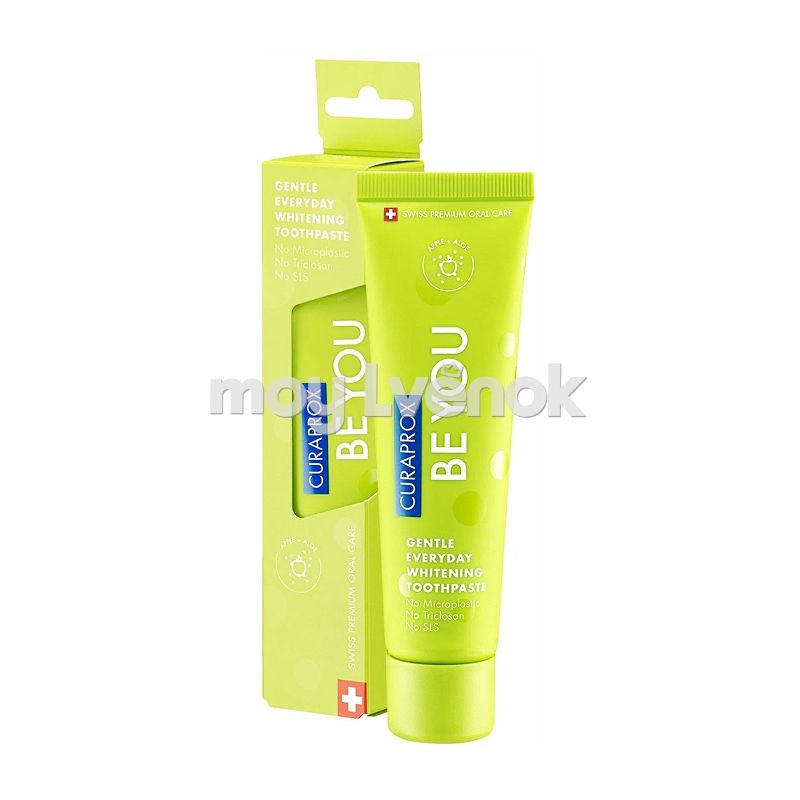 Деликатно отбеливающая зубная паста со вкусом яблока и алоэ для ежедневного применения Curaprox Be You с содержанием фторидов 950 ppm – это профессиональное и безопасное средство для ухода за зубами взрослых и детей от 3 лет.
