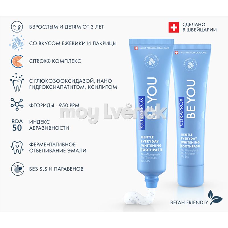 Не содержит: SLS и триклозан; парабены; искусственные подсластители; красители, загустители, глютен и консерванты.