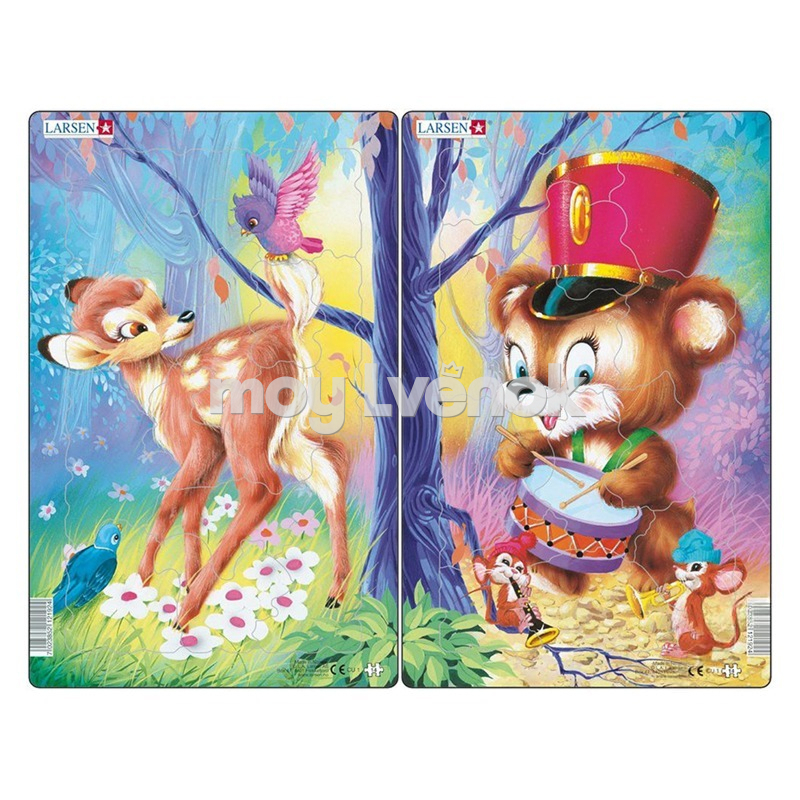 - На одной картинке изображен милый олененок с птичками, а на второй забавный медвежонок в шапочке, с барабаном и смешными мышатами, играющими на дудочках.