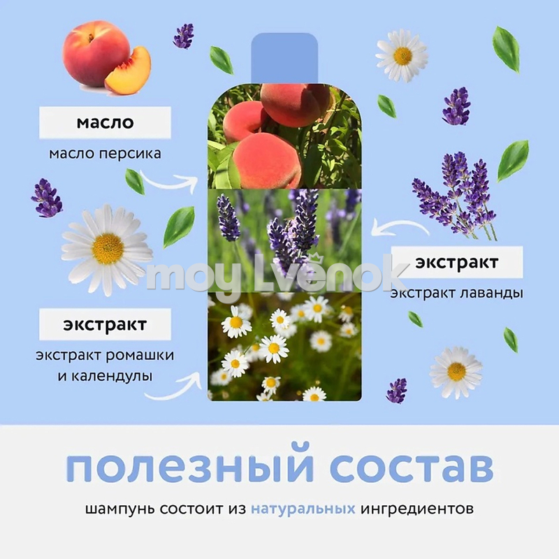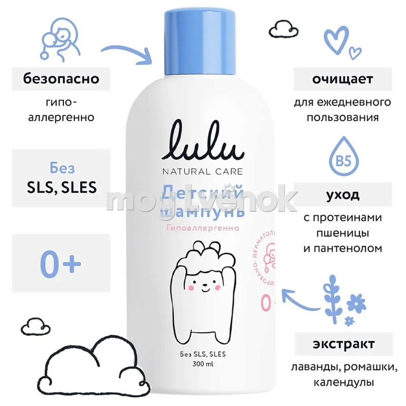 LULU Детский шампунь с протеинами пшеницы, маслом персика, экстрактами лаванды, календулы, ромашки