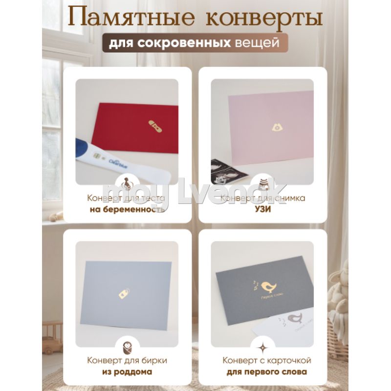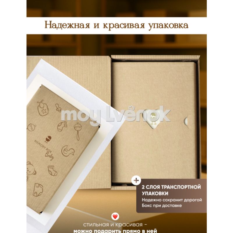 Набор Маленький «Memory BoxBaby» - это компактная коробочка, в которой вы можете сохранить самые ценные воспоминания о появлении вашего малыша. Набор включает в себя 9 предметов. Вы можете пользоваться как стандартным набором, так и добавлять в коробочку любые дорогие сердцу предметы.