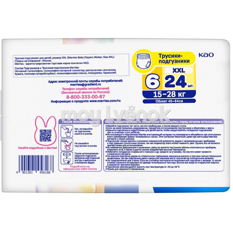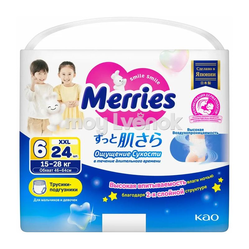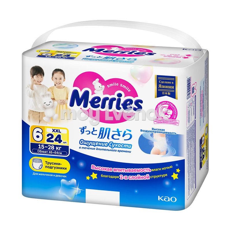 Японские дышащие трусики Merries идеально подойдут малышу. Два впитывающих слоя в трусиках Merries размера XXL обеспечивают быстрое впитывание и надежное удержание мочи, предотвращая протекание, даже если ребенок много ворочается ночью. С Merries спокойный сон до самого утра!