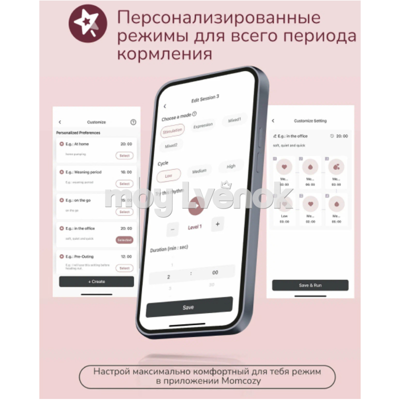 Три стандартных режима (Стимуляция / Сцеживание / Смешанный) доступны на корпусе устройства, а два дополнительных — в мобильном приложении Momcozy. Настройка индивидуального ритма помогает достичь максимального комфорта и эффективности.