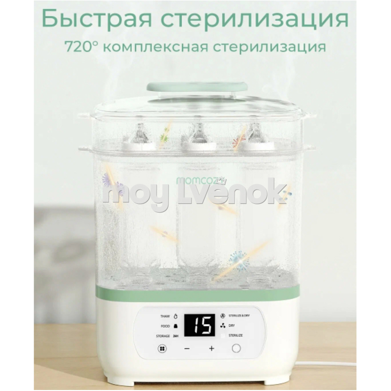 Устройство сочетает функции стерилизации, сушки, подогрева, размораживания и хранения детских бутылочек и принадлежностей. Паровая стерилизация с последующей сушкой гарантирует гигиеничность и защиту от бактерий.