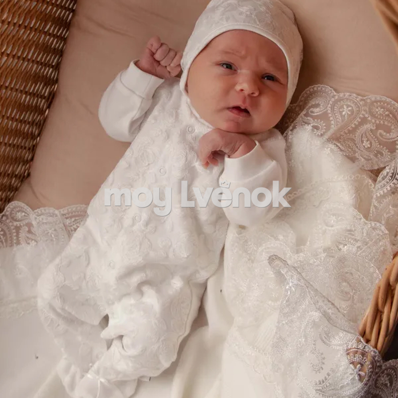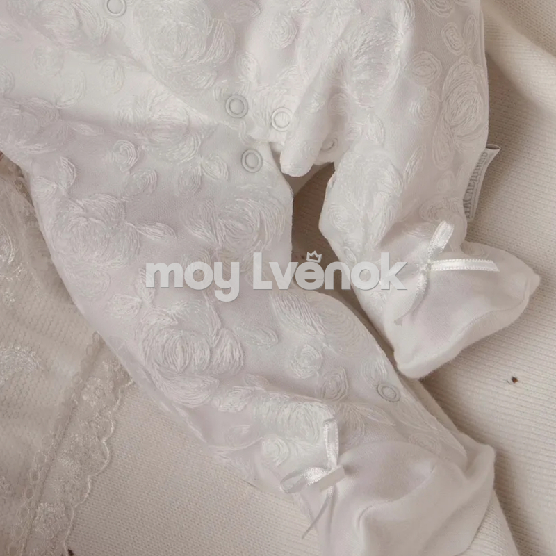 Очаровательный комплект для новорожденных с нежным кружевом идеально подойдёт на выписку из роддома и для первой фотосессии и для девочки, и для мальчика. Нательный комплект выполнен из 100% хлопка высочайшего качества (интерлок) и состоит из комбинезона и чепчика. Комбинезон застегивается на удобные , плоские кнопки по всей длине ,что позволяет быстро и без усилий при необходимости переодеть малыша.