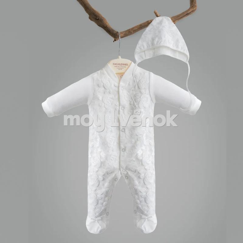 У чепчика практичные завязки с помощью которых легко регулировать посадку по голове ребенка. Данный комплект понравится малышу ,а особенно будущей маме, которая оценит его красоту и практичность, потому что комплект можно использовать не только на выписку, но и для повседневной носки.