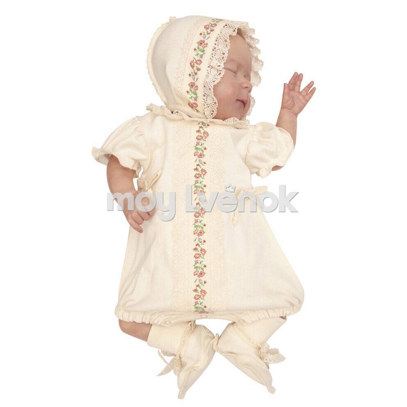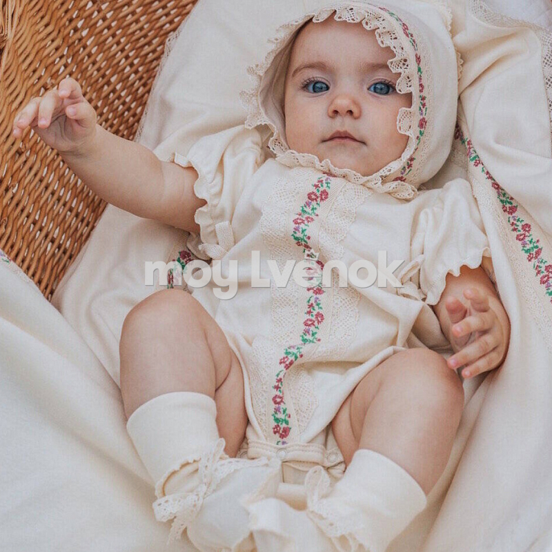 Комплект не только на прогулку , но и украсит торжественную выписку из роддома.Натуральный органический хлопок создает атмосферу комфорта , а дизайнерское решение в отделке, делают комплект уникальным стильным современным. Комплект для девочки: комбинезон (песочник), чепчик, пинетки.