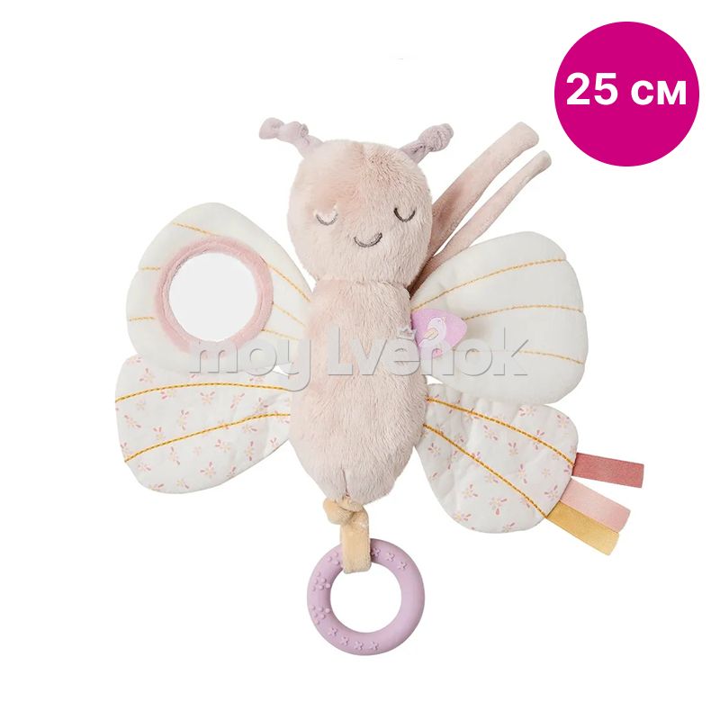 Бабочка небольшого размера, ее удобно брать в руки, есть зеркало и силиконовое кольцо для прорезывания зубов.