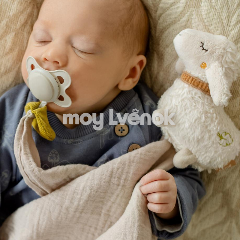 Муслиновый комфортер в виде милой овечки станет верным спутником вашего малыша. Он очень приятный на ощупь, поэтому дети обожают с ним обниматься. При этом комфортер оснащён удобным колечком — держателем для пустышек.