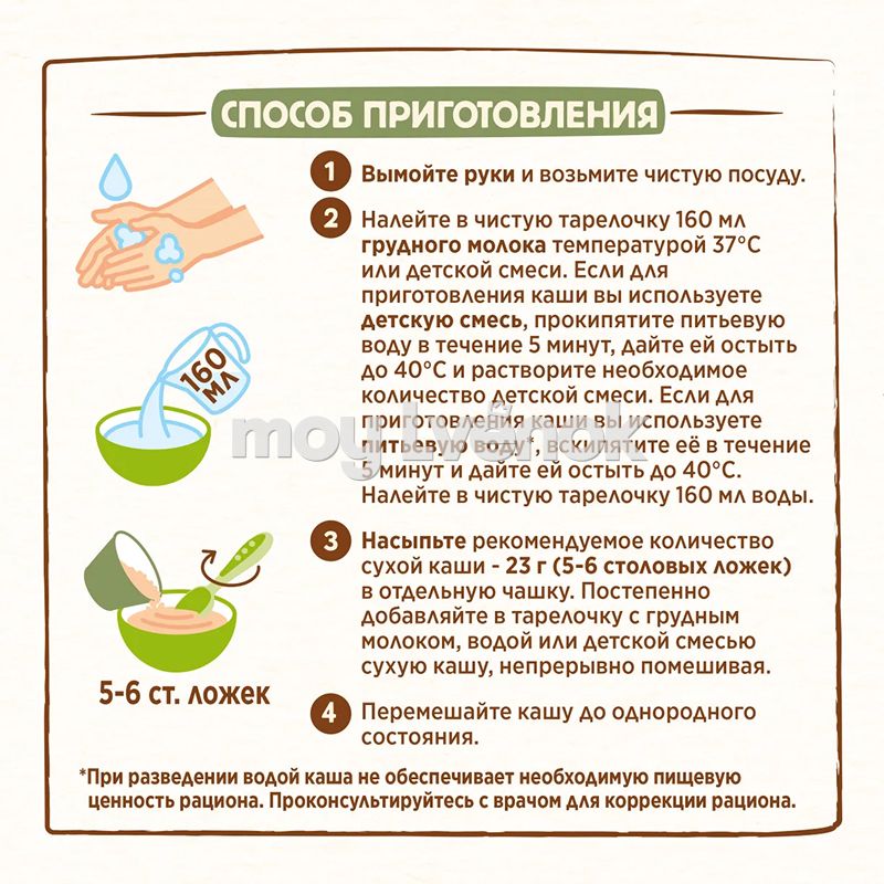 Меры предосторожности: Не варите! Кормите ребенка чистой ложкой. Кашу следует готовить непосредственно перед каждым кормлением. Не храните оставшуюся после кормления разведенную кашу. Начинайте вводить новый продукт с 1 чайной ложки, постепенно увеличивая порцию до необходимого объема.