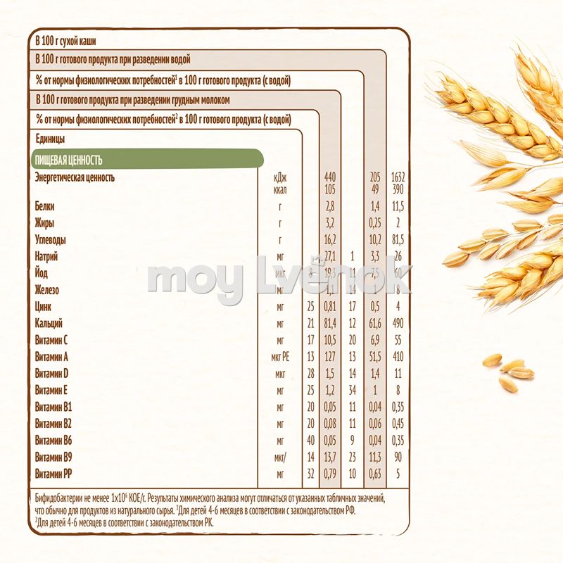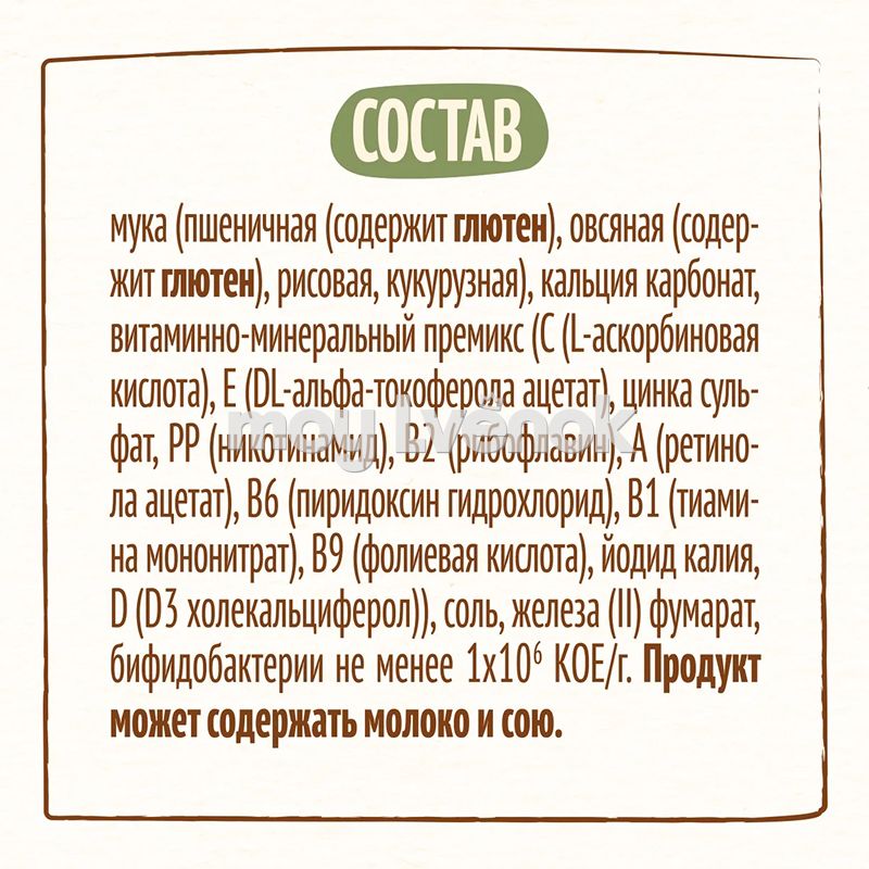 Состав: Мука (пшеничная (содержит глютен), овсяная (содержит глютен), рисовая, кукурузная), кальция карбонат, витаминно-минеральный премикс (С (L-аскорбиновая кислота), E (DL-альфа-токоферола ацетат), цинка сульфат, РР (никотинамид), В2 (рибофлавин), A (ретинола ацетат), В6 (пиридоксин гидрохлорид), В1 (тиамина мононитрат), B9 (фолиевая кислота), йодид калия, D (D3 холекальциферол)), соль, железа (II) фумарат, бифидобактерии не менее 1х106 КОЕ/г. Продукт может содержать молоко и сою.
