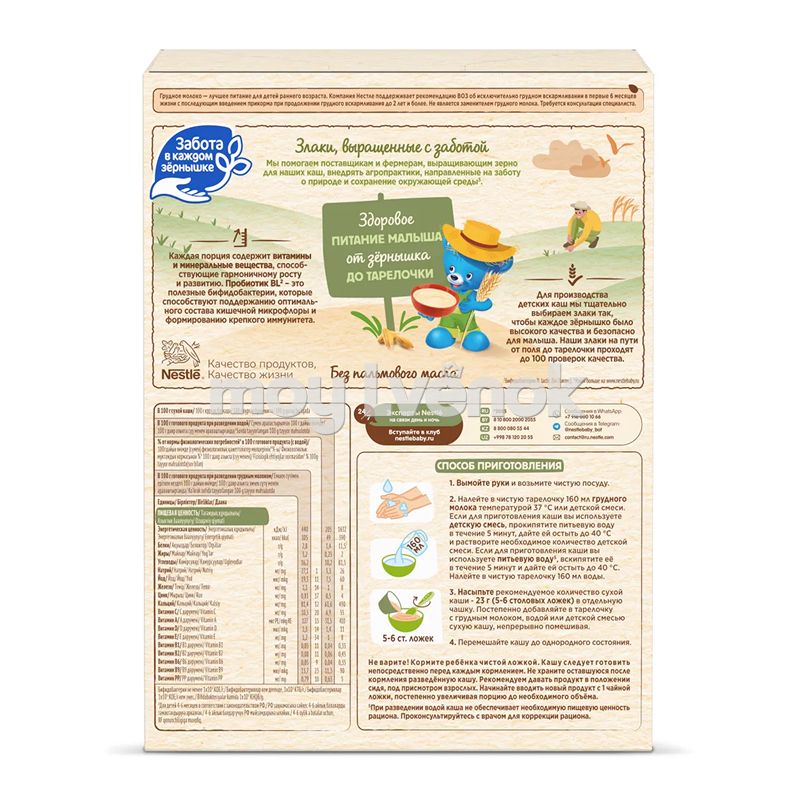 - Каша Nestlé обогащена пробиотиком BL, который способствует нормализации пищеварения, росту здоровой микрофлоры и укреплению иммунитета, что очень важно в период прикорма.