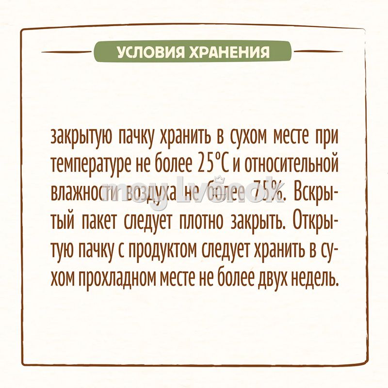 Условия хранения: закрытую пачку хранить в сухом месте при температуре не более 25°С и относительной влажности воздуха не более 75%. Вскрытый пакет следует плотно закрыть. Открытую пачку с продуктом следует хранить в сухом прохладном месте не более двух недель.
