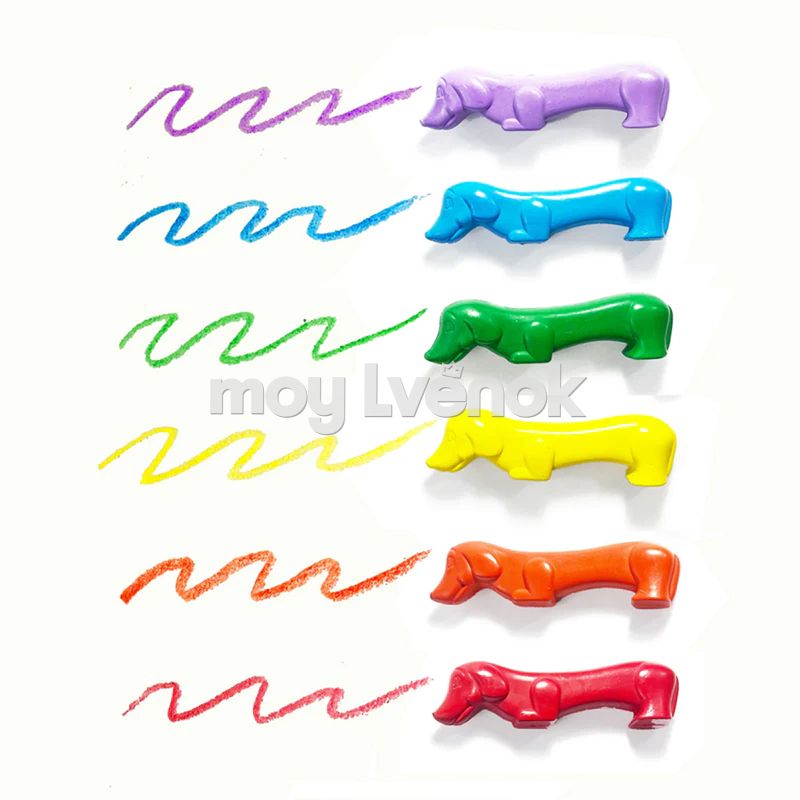 Набор из 6 разноцветных восковых мелков в виде собачек, наверняка вызовет восторг вашего малыша, потому что в наборе есть не только основные цвета радуги, но и каждый мелок-карандаш сделан в форме милой таксы. Они станут отличным подарком или добавят веселья любой детской вечеринке!