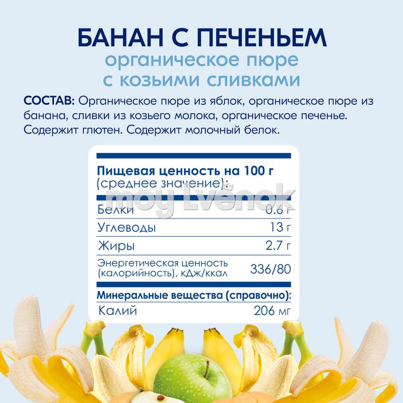 Органическое пюре из яблок, органическое пюре из банана, сливки из козьего молока, органическое печенье.