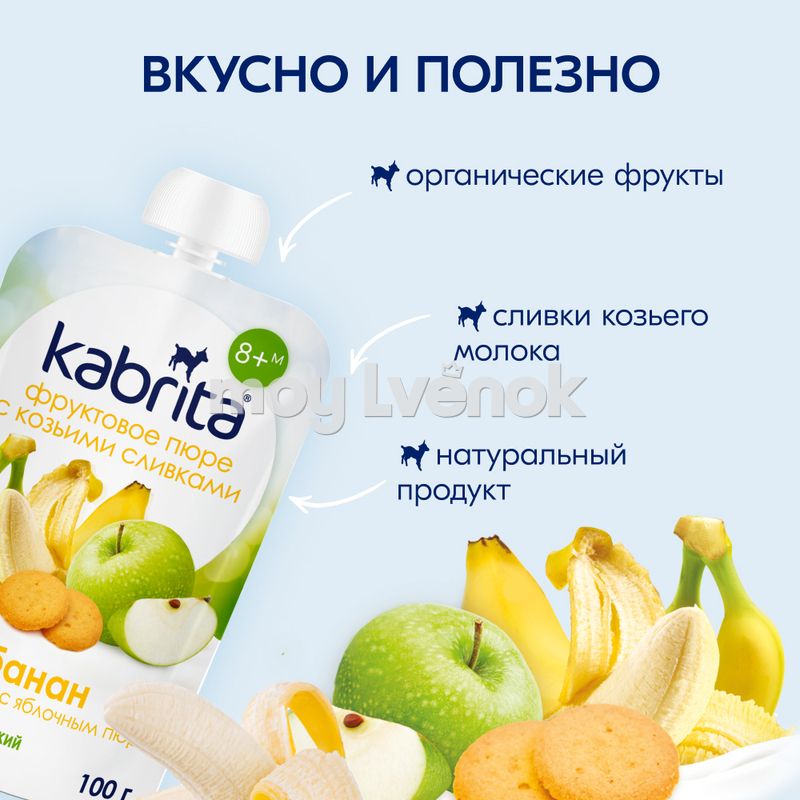 Пюре Kabrita® - спелые бананы, сладкое яблоко и вкусное детское печенье в сочетании с нежными сливками козьего молока. Удобно брать с собой. Идеальное решение для полдника, второго завтрака, перекуса, прогулок и путешествий как для малышей, так и для детей более старшего возраста. Удобная и современная мягкая упаковка способствует развитию мелкой моторики малыша и навыков самостоятельности. Не требует хранения в холодильнике.
