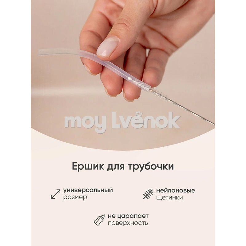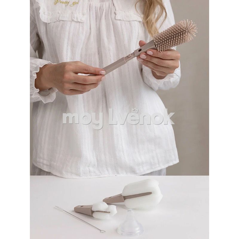 - В комплект входит несколько насадок: силиконовая губка для бутылочек, две поролоновые насадки для соски и бутылочки, а также металлический ершик с нейлоновыми щетинками для трубочек.