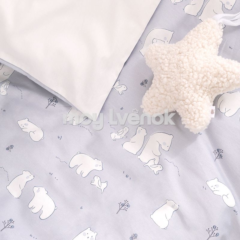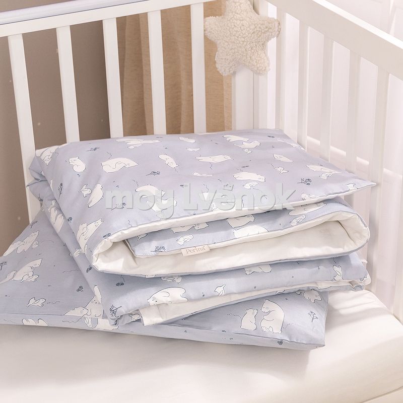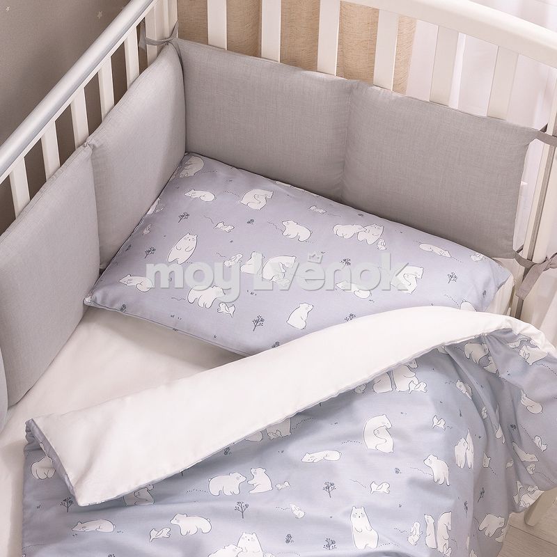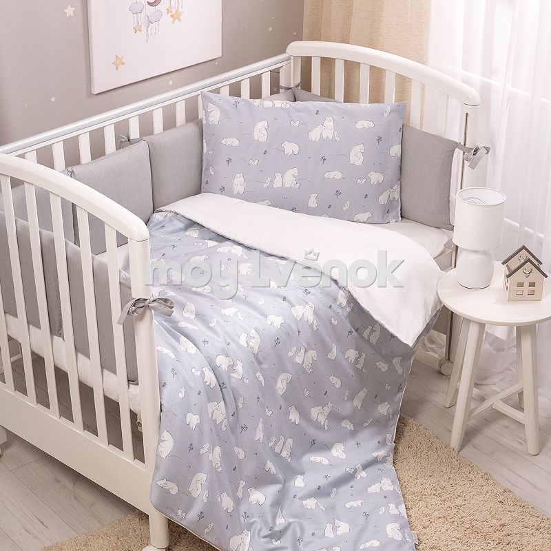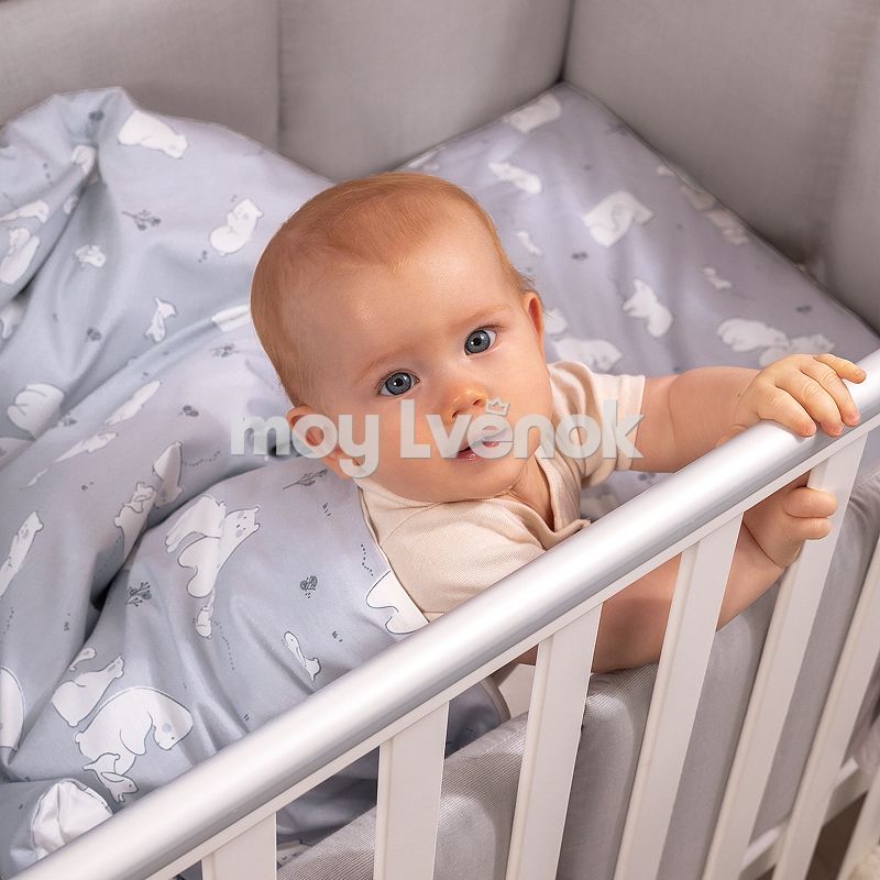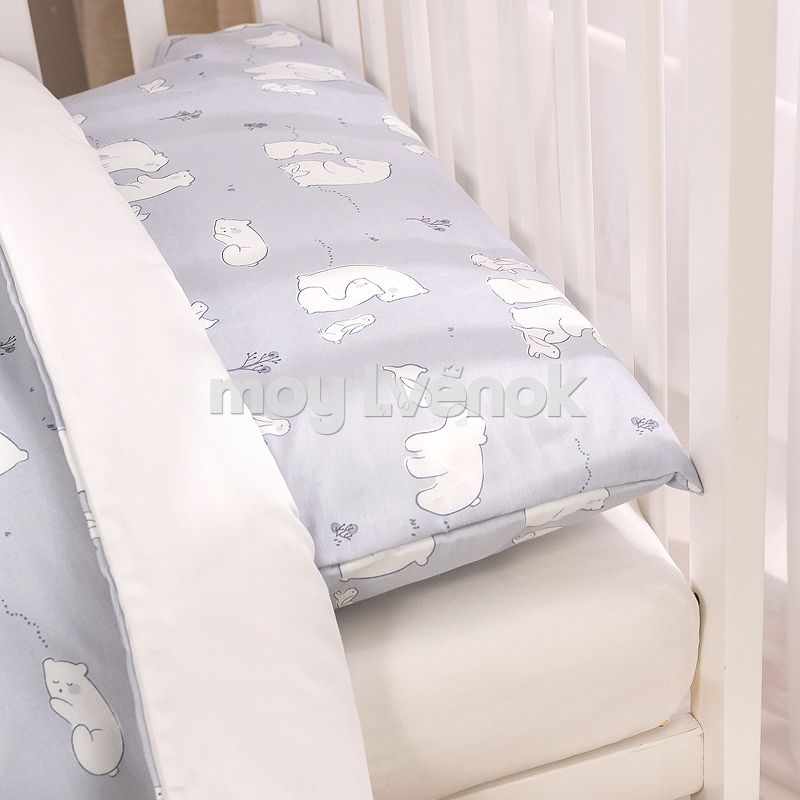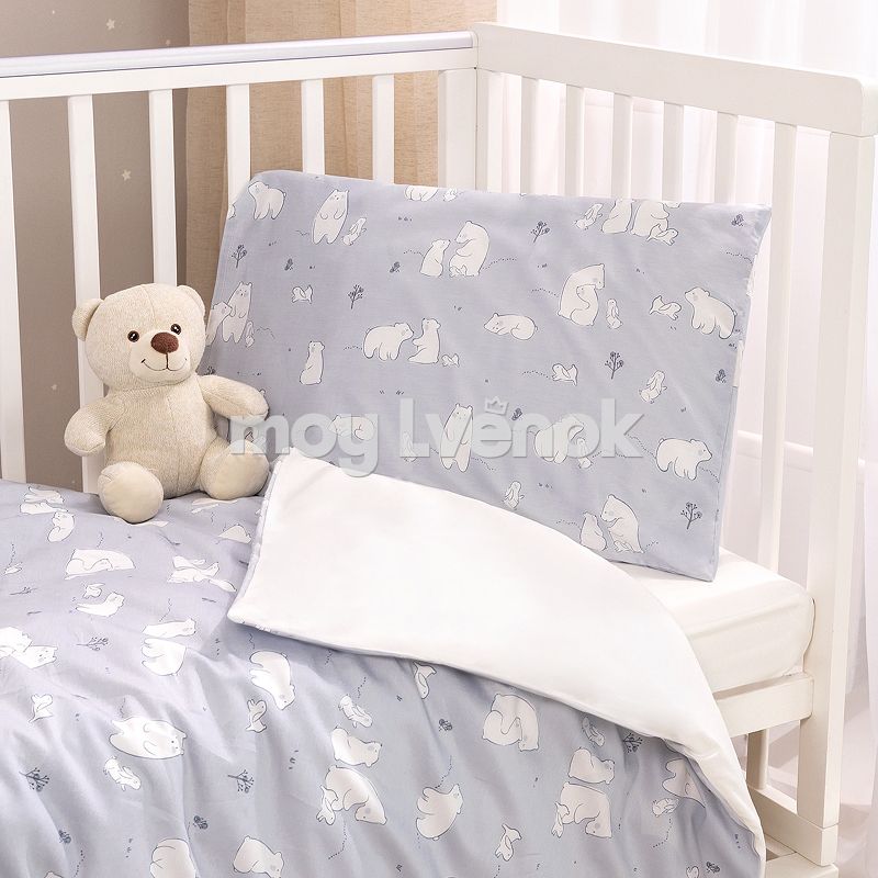 Комплект разработан для стандартных кроваток со спальным местом 120×60 см и включает 3 предмета: простыню на резинке, наволочку и пододеяльник на молнии.