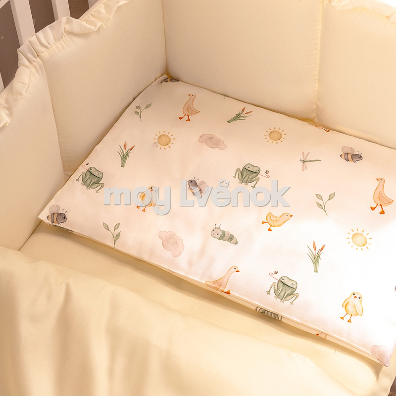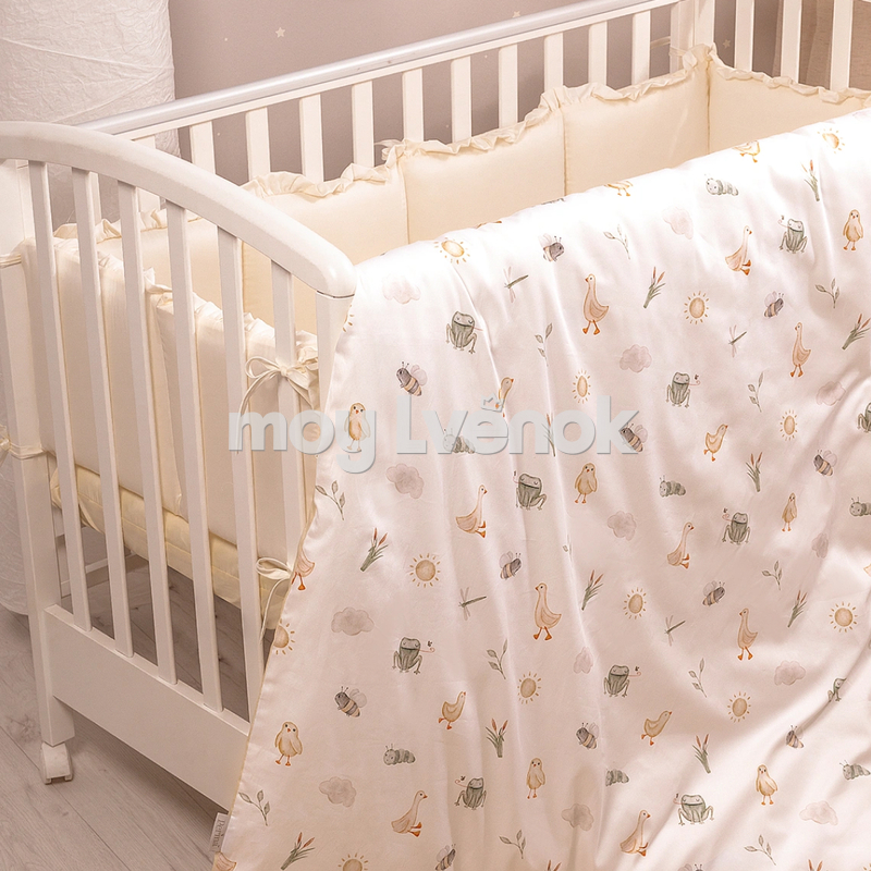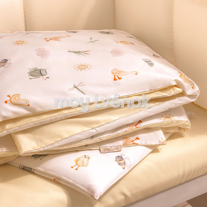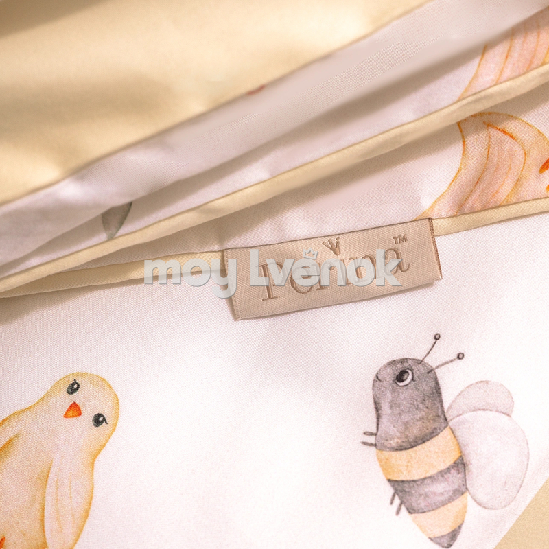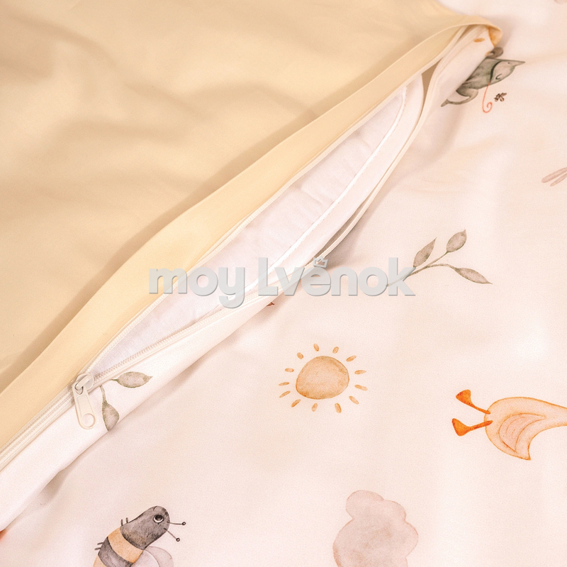 Уникальный принт с милыми зверюшками украсит комнату и не помешает малышу уснуть — оттенки узора мягкие и натуральные. Акварельные персонажи будут интересны ребенку после пробуждения. Пододеяльник двусторонний, гармонично сочетается как с наволочкой, так и с однотонной простыней.