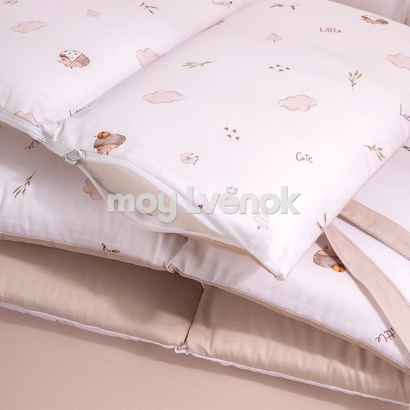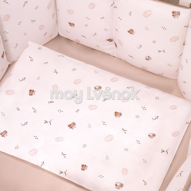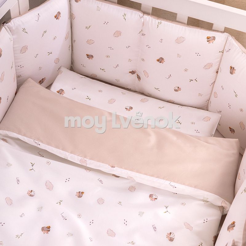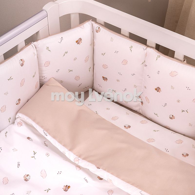 Комплект включает 6 предметов: пододеяльник на молнии, наволочку, простыню на резинке, одеяло, подушку и защитные бортики.