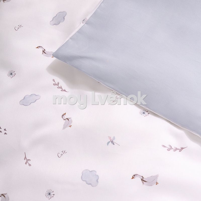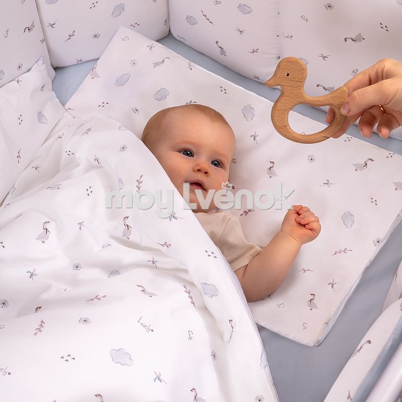 Комплект включает 6 предметов: пододеяльник на молнии, наволочку, простыню на резинке, одеяло, подушку и защитные бортики.