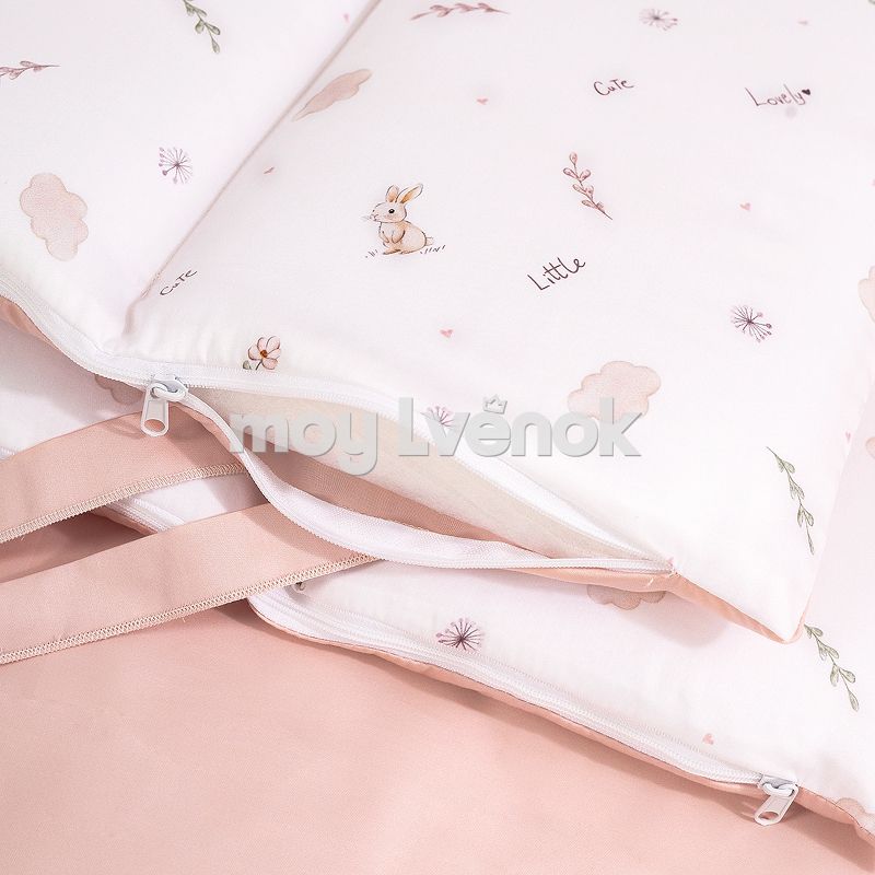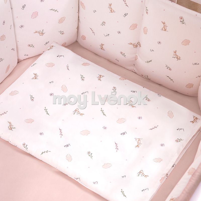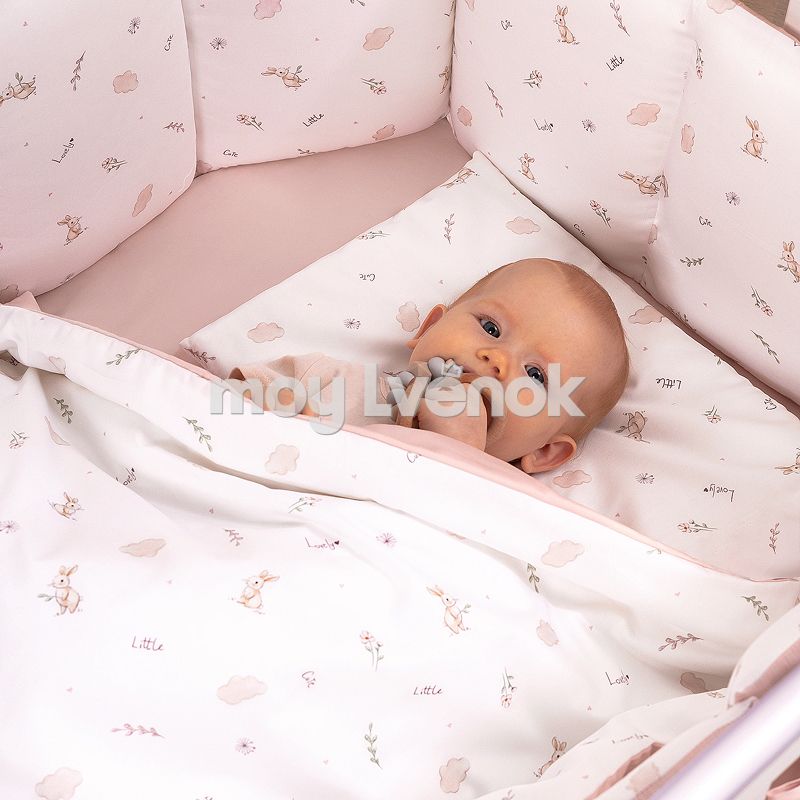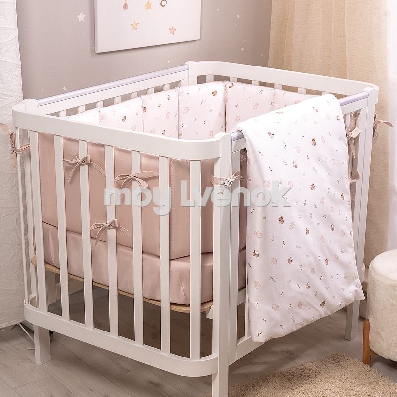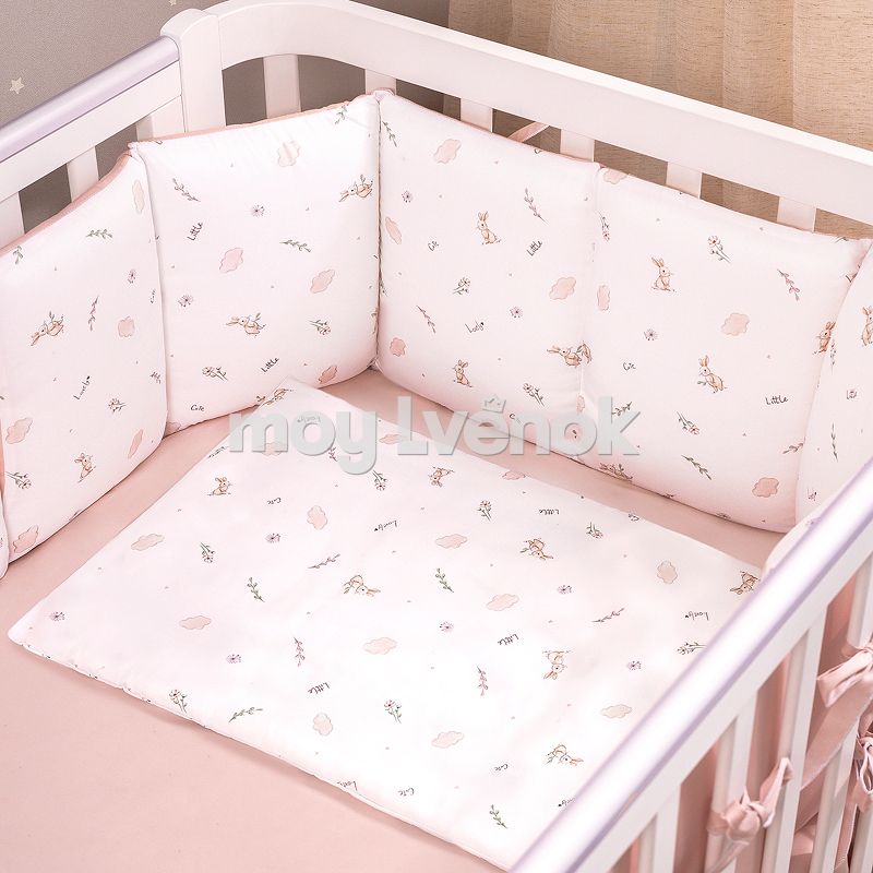 Комплект включает 6 предметов: пододеяльник на молнии, наволочку, простыню на резинке, одеяло, подушку и защитные бортики.