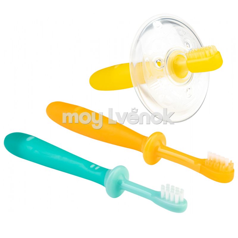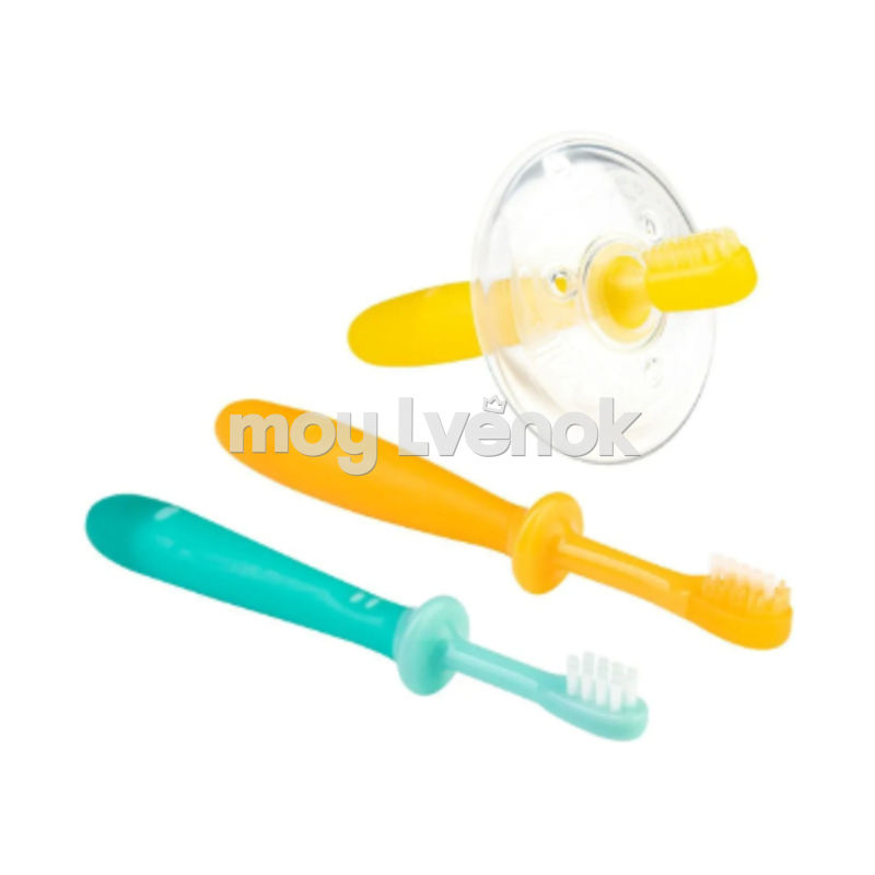 Шаг 1: подготовка ребенка к ощущению зубной щетки во рту еще до момента появления первого зуба, резиновая щетинка мягко массирует десна (примерно 4.5–9 мес.).