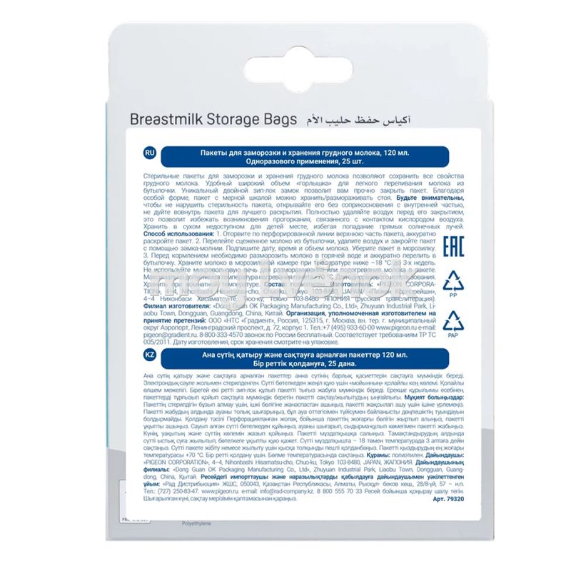 Изготовлены из полиэтилена низкой плотности (полиэтилен высокого давления) – отличающегося особой прочностью, легко выдерживает воздействие низких температур. Является экологически безопасным материалом, как для человека, так и для окружающей среды, так как он не выделяет никаких токсичных веществ и абсолютно безопасно может использоваться для контакта с продуктами питания и изготовления детских товаров. Пакеты одноразовые, стерильно упакованы, подходят ко всем молокоотсосам, рекомендуются и для кратковременного и для длительно хранения любых объёмов грудного молока.