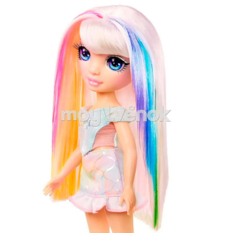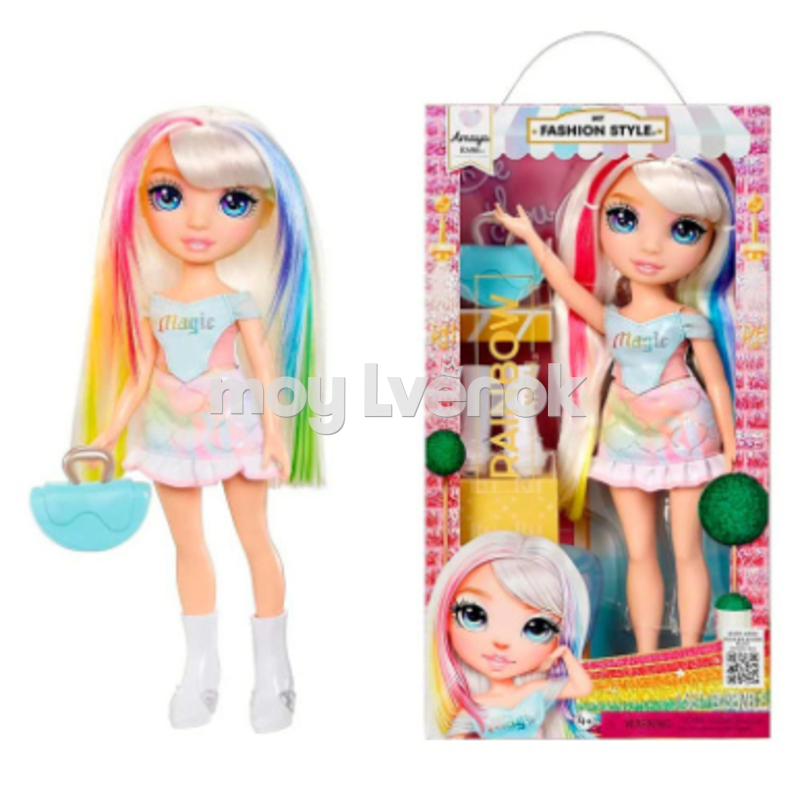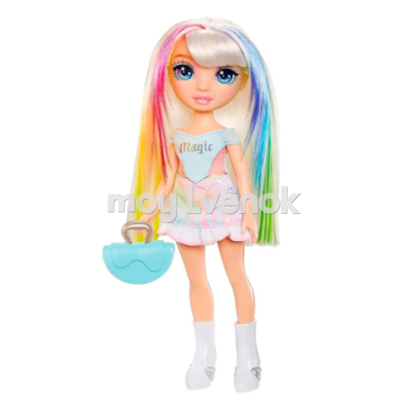 Кукла Фэшн стайл Амайа 28 см Rainbow High68998. Куколка Rainbow High Амайя — это воплощение смелой фантазии и индивидуальности. Ее образ построен на игре контрастов: длинные белые волосы с яркими разноцветными прядями обрамляют выразительное лицо с большими задумчивыми глазами. На Амайе — дерзкий топ с надписью Magic и мини-юбка с оборкой, которые вместе с высокими ботильонами и стильной сумочкой создают законченный модный «лук». Кукла невероятно подвижна: она может принимать самые разные позы, что позволяет детям разыгрывать сцены из школьной жизни, шопинга или придумывать собственные сюжеты.