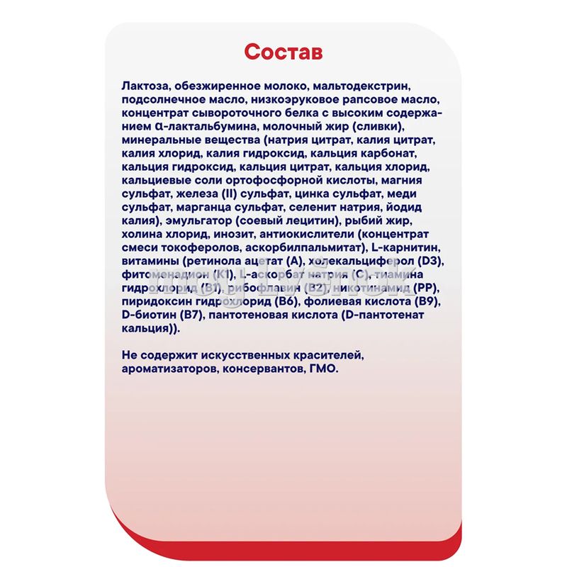 Лактоза, обезжиренное молоко, мальтодекстрин, подсолнечное масло, низкоэруковое рапсовое масло, концентрат сывороточного белка с высоким содержанием α-лактальбумина, молочный жир (сливки), минеральные вещества (натрия цитрат, калия цитрат, калия хлорид, калия гидроксид, кальция карбонат, кальция гидроксид, кальция цитрат, кальция хлорид, кальциевые соли ортофосфорной кислоты, магния сульфат, железа (II) сульфат, цинка сульфат, меди сульфат, марганца сульфат, селенит натрия, йодид калия), эмульгатор (соевый лецитин), рыбий жир, холина хлорид, инозит, антиокислители (концентрат смеси токоферолов, аскорбилпальмитат) , L-карнитин, витамины (ретинола ацетат (А), холекальциферол (D3), фитоменадион (К1), L-аскорбат натрия (С), тиамина гидрохлорид (B1), рибофлавин (В2), никотинамид (РР), пиридоксин гидрохлорид (В6), фолиевая кислота (В9), D-биотин (В7), пантотеновая кислота (D-пантотенат кальция)).
