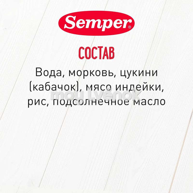 Состав: Вода, морковь, цукини (кабачок), мясо индейки, рис, подсолнечное масло.