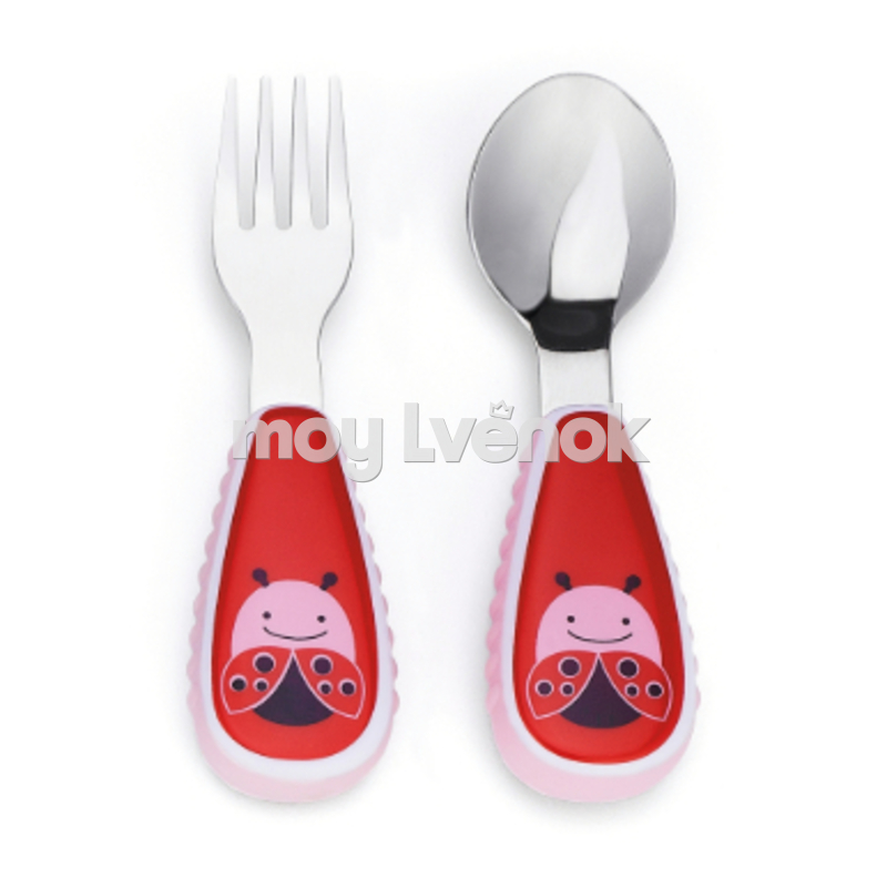 Яркие столовые приборы с прорезиненной рукояткой и яркими животными Skip Hop: вилка и ложка - идеально подходят для маленьких ручек ребенка и быстро научать его принимать пищу самостоятельно.