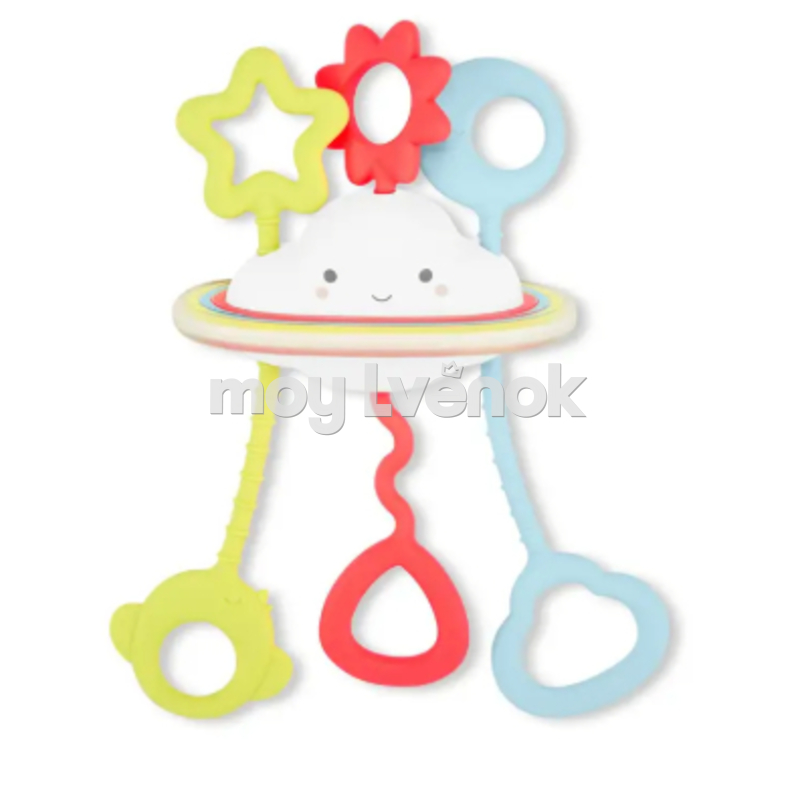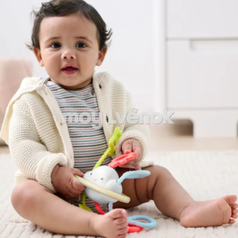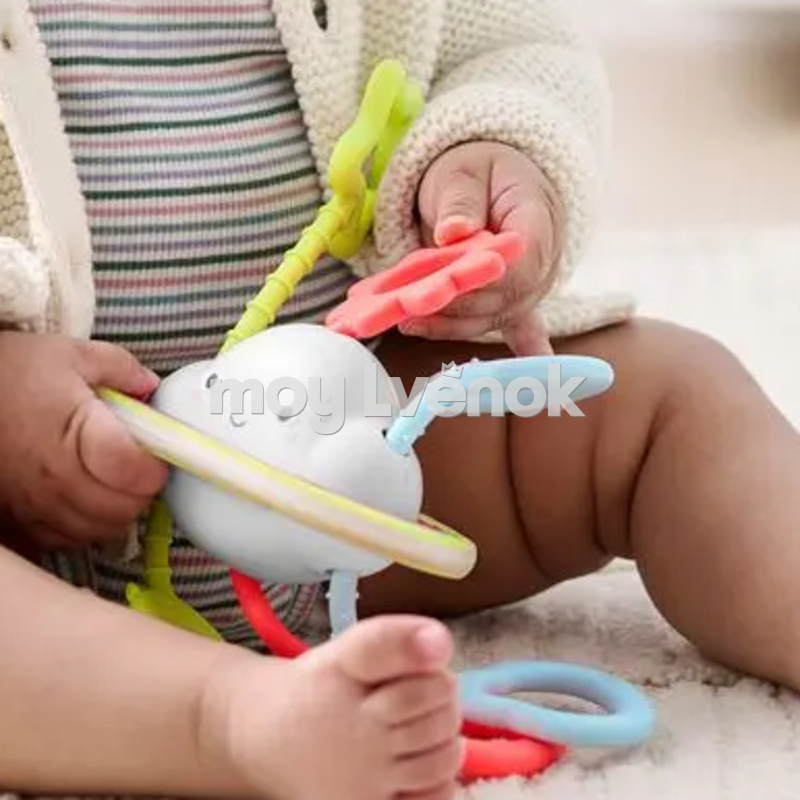 Изготовленная из мягкого силикона, она предназначена для прорезывания зубов, наполнена различными текстурами, небесными фигурами и издает интересные звуки при натяжении язычков. Отличное знакомство с причинно-следственными связями, а также помощь в развитии моторики.