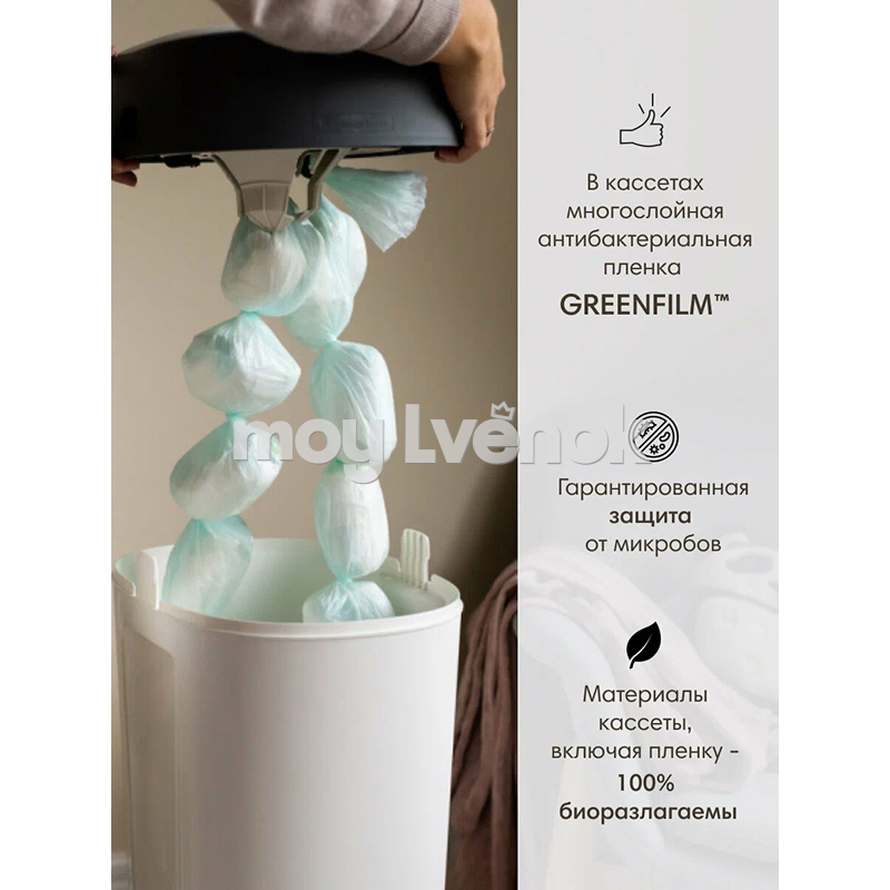- Многослойный антибактериальный материал GREENFILM™ в 100 раз эффективнее обычных пакетов для подгузников, поскольку он защищен биоцидом серебра Biomaster (антибактериальная защита присутствует только в пленке.