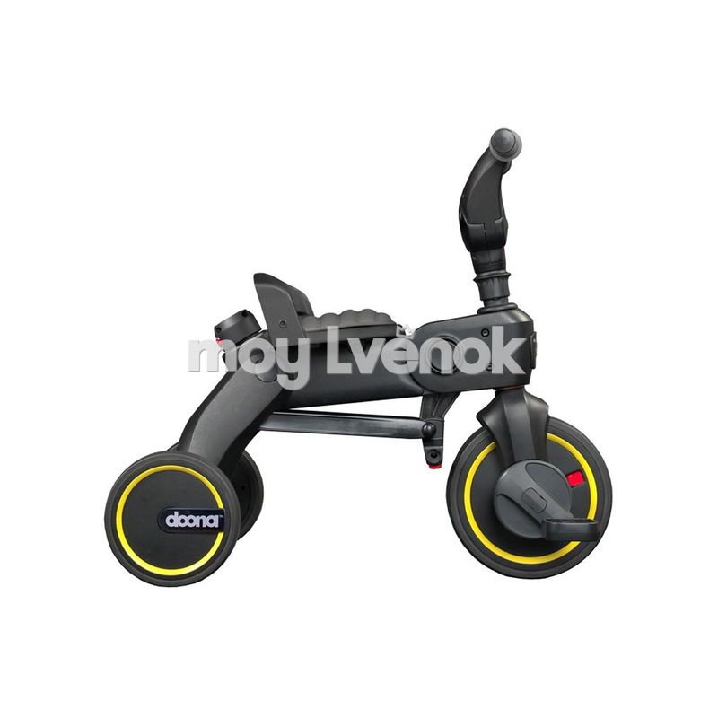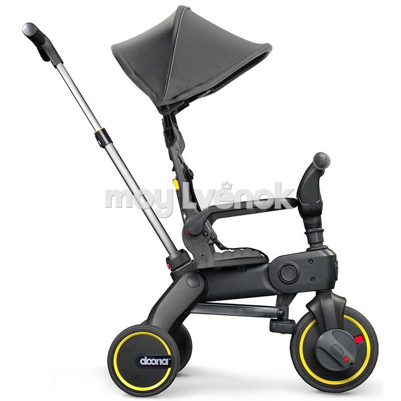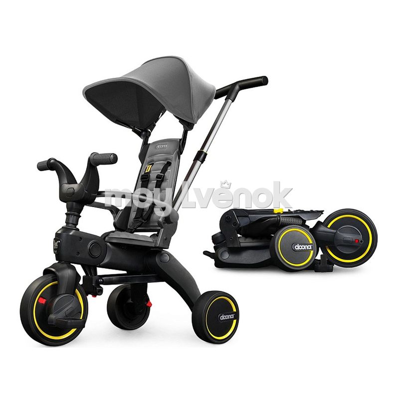 Doona Liki Trike - самый компактный складной велосипед в мире, который растет вместе с малышом: 10-18 мес.: базовый вариант с максимальной безопасностью - ручка, капор, высокая спинка, бампер, подножки для ног; 18-24 мес.: расширенный вариант с большей свободой действий; 24-30 мес.: переходной режим - ручка, высокая спинка, педали и/или подножки; 30-36 мес.: велосипед с низкой спинкой и педалями.