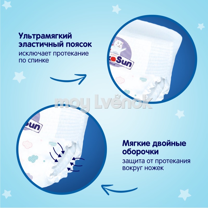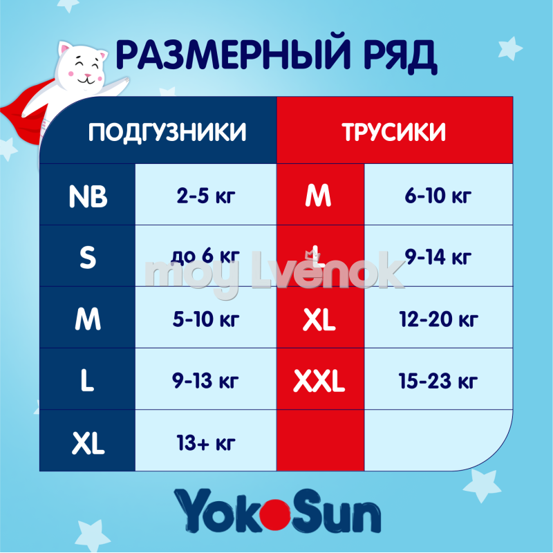 Трусики-подгузники YokoSun – это новые подгузники, отвечающие всем требованиям современных мам, имеют знак качества экологичности «Эко» и рекомендованы дерматологами. В изготовлении подгузников используется японский абсорбент, который быстро впитывает и удерживает влагу, поддерживая сухость в течение длительного времени.