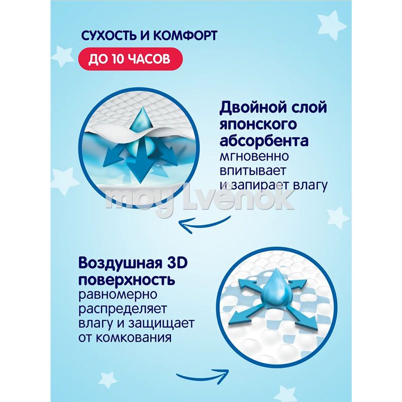 - Инновационная структура внутреннего слоя предотвращает комкование абсорбента при намокании.