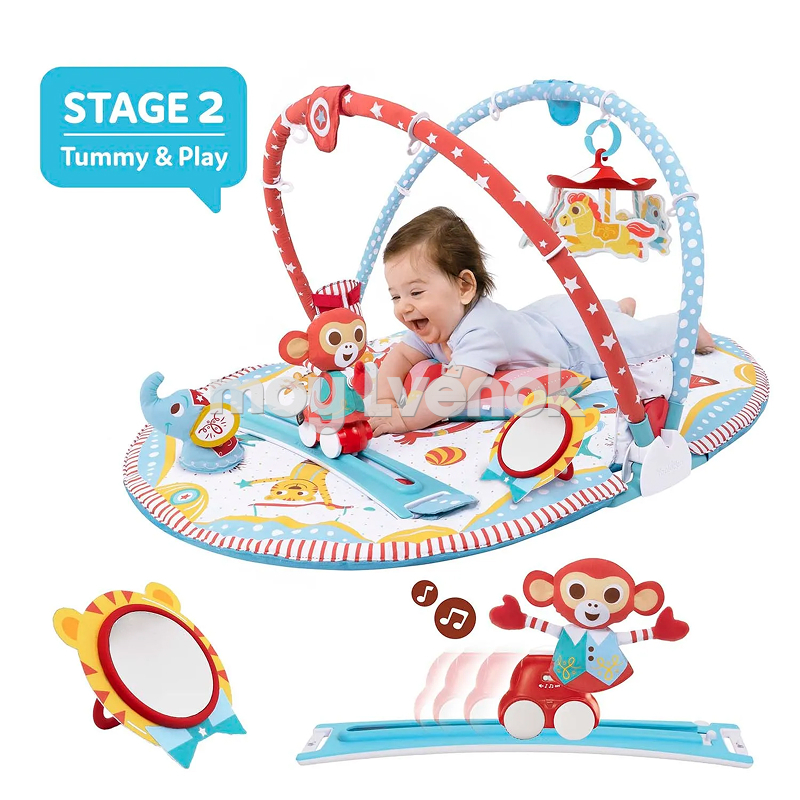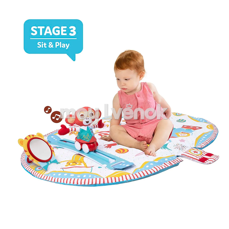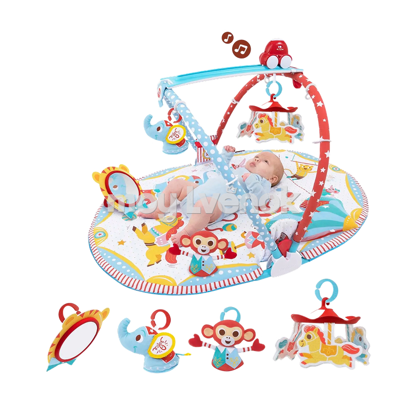 - Большое зеркало, которое помогает развивать навыки самоидентификации и визуального восприятия, подушка под животик для комфорта в положении лежа на животе, дорожка с самодвижущейся машинкой, которая стимулирует двигательные навыки и координацию, а также игрушка-карусель и цирковые фигурки слона и обезьянки с погремушками внутри, способствующие развитию тактильных и зрительных навыков.