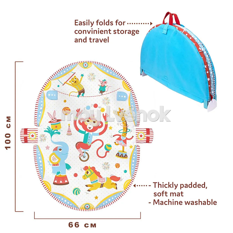 - Размер разложенного коврика составляет 100х66 см, обеспечивая достаточно пространства для активной игры и движения.